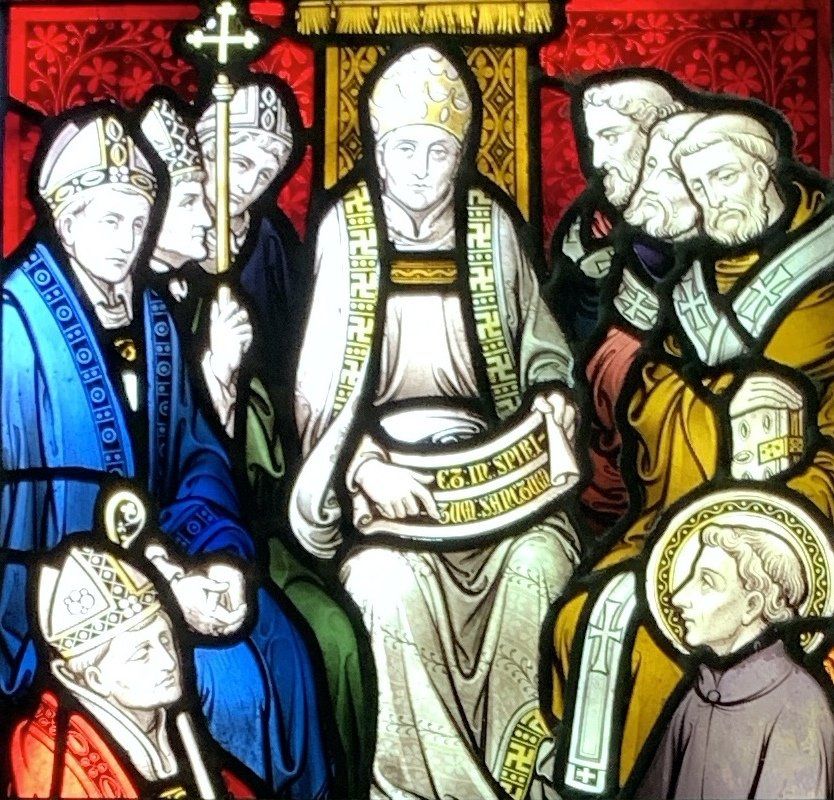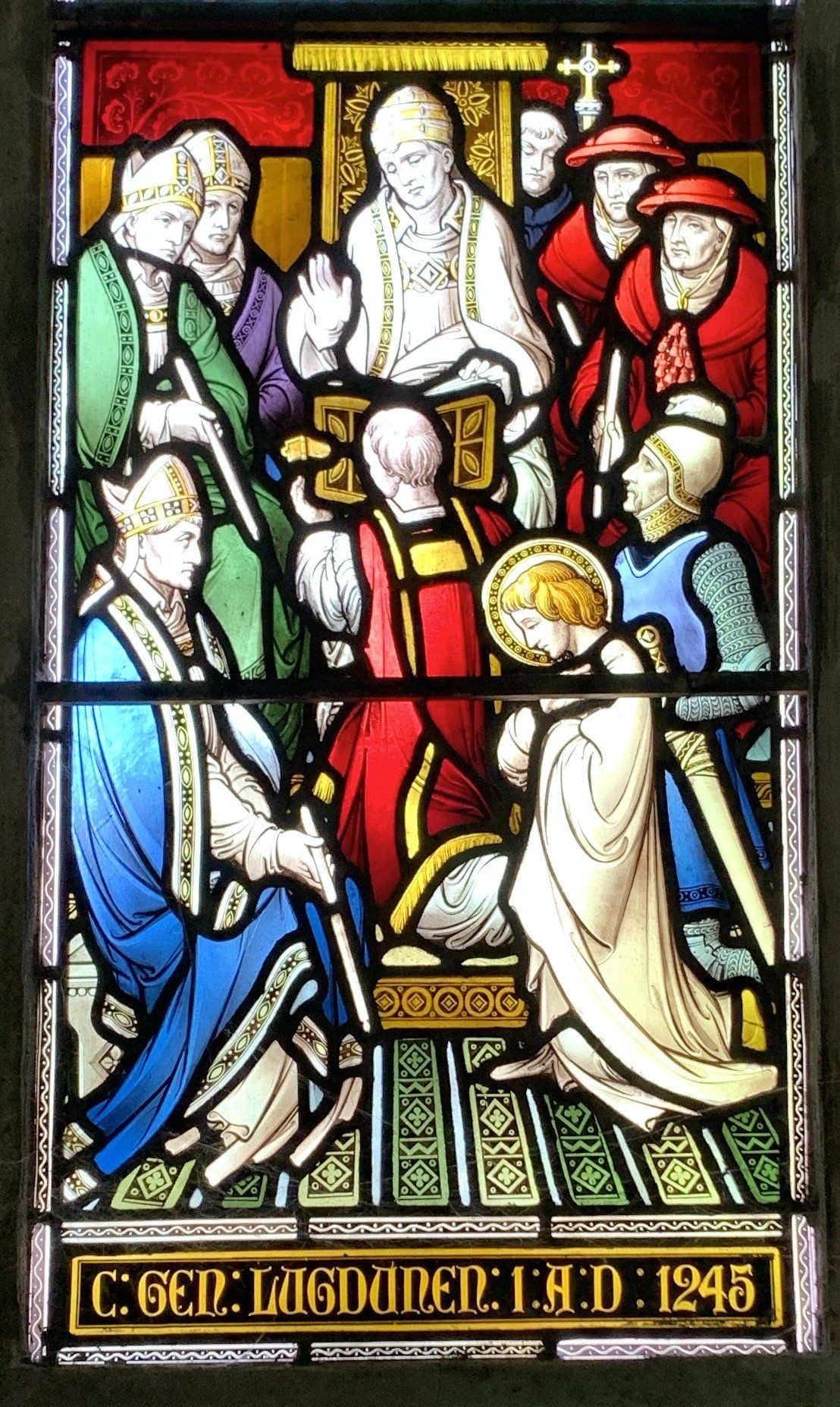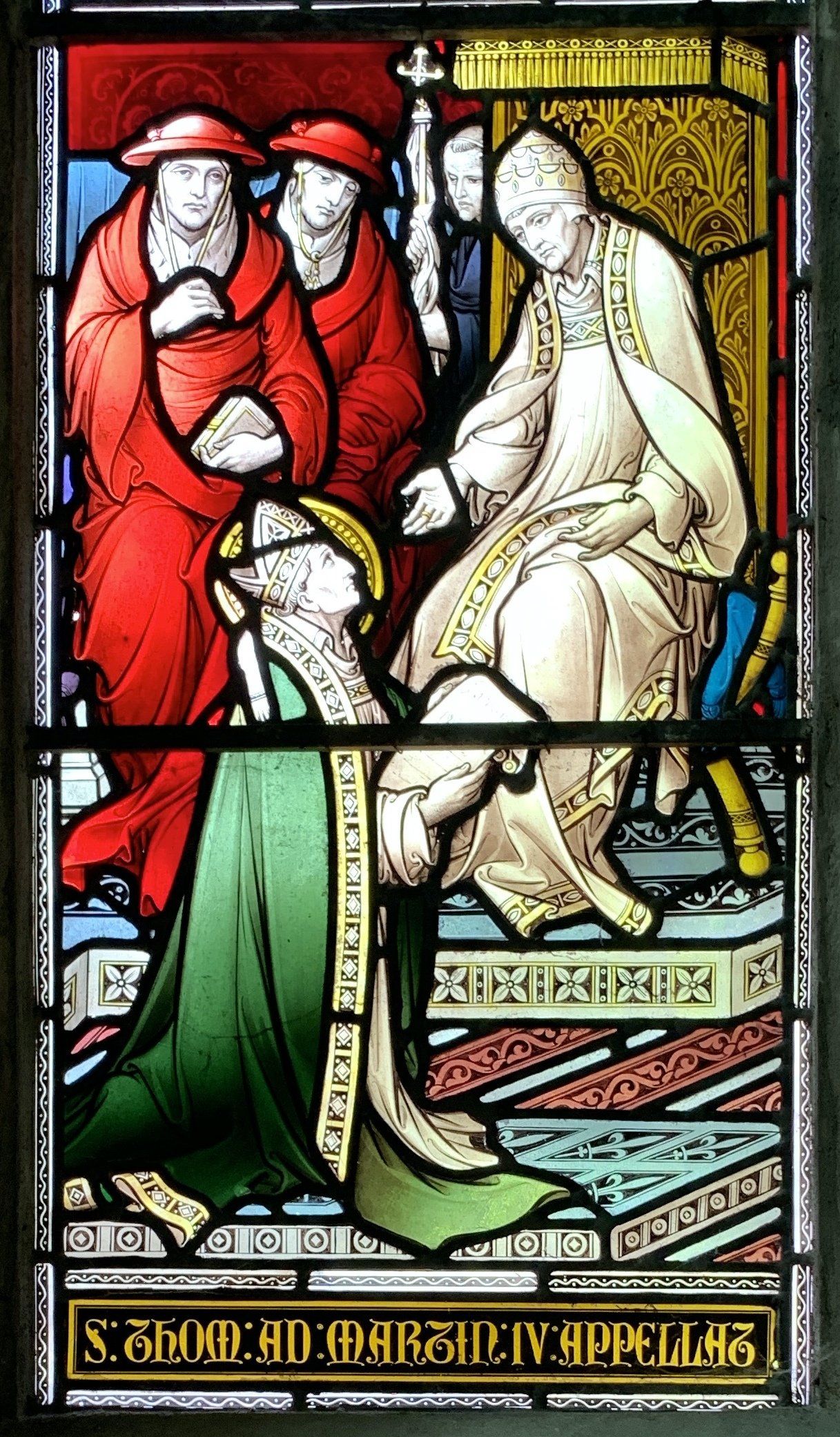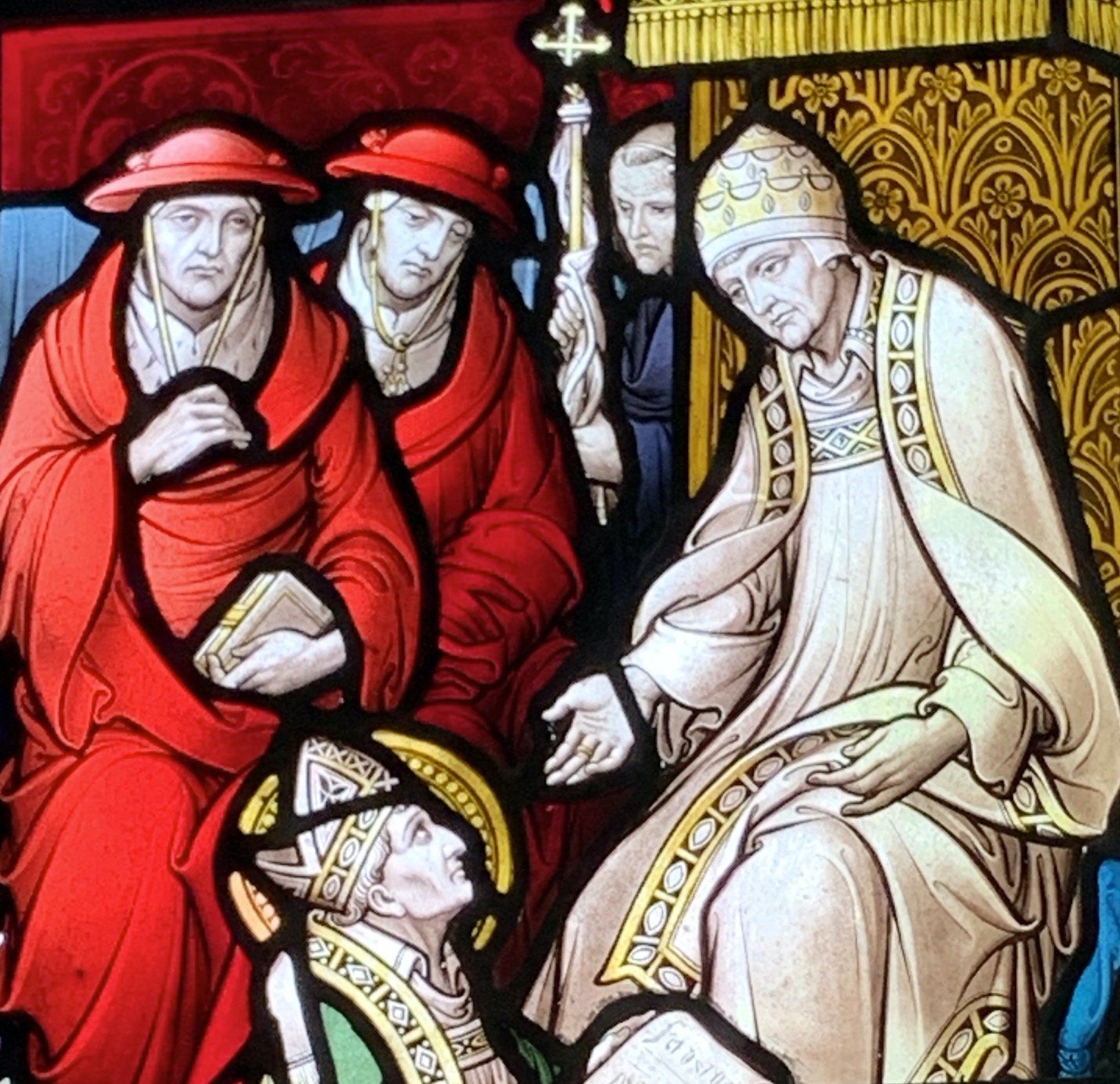 The bottom of the window (shown above) depicts major events from the life of St. Thomas himself. On the left he is shown at his ordination in 1245, then as Chancellor of Oxford University, followed by his attendance at the Second Council of Lyons in 1274. The following year he was consecrated as Bishop of Hereford, but unfortunately, he later fell out with Archbishop Peckham of Canterbury, who excommunicated him. Thomas decided to appeal to the pope and set out for Rome. In the fourth panel he makes his successful appeal to Pope Martin IV in Orvieto in 1282, but shortly afterwards he died while still in Orvieto. The last panel shows the shrine containing his remains being brought into the cathedral in the presence of Edward III. His cause for canonisation was taken up by his successor Bishop Swinfield. The church, however, spent some time examining his cause and the many varied accounts of miracles attributed to him by pilgrims to his shrine before proclaiming him saint in 1320. It was this event that was to be marked by Mass at the Cathedral, at the invitation of the Dean of Hereford, Michael Tavinor.