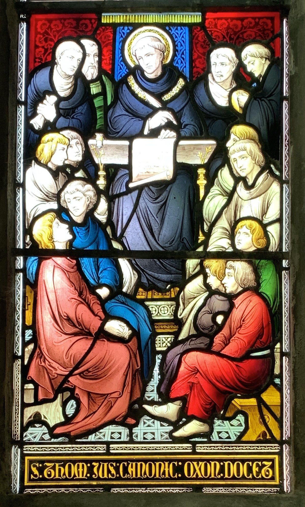 At Belmont itself the life of Saint Thomas is vividly recorded in the great West Window of the Abbey Church. The window was installed in 1882 to commemorate the 600th anniversary of the death of this great Bishop of Hereford. When the church and attached monastery, dedicated to St Michael & All Angels, were established from 1859 there was much local opposition to a new Catholic foundation. Belmont’s Founder Francis Wegg-Prosser, High Sheriff of the County, was most anxious to emphasize the links between the new church and Hereford city. So the designer of the window sought to create this wonderful illustration of the life of St. Thomas, to emphasise the connection with the cathedral and the ecclesiastical history of the city.