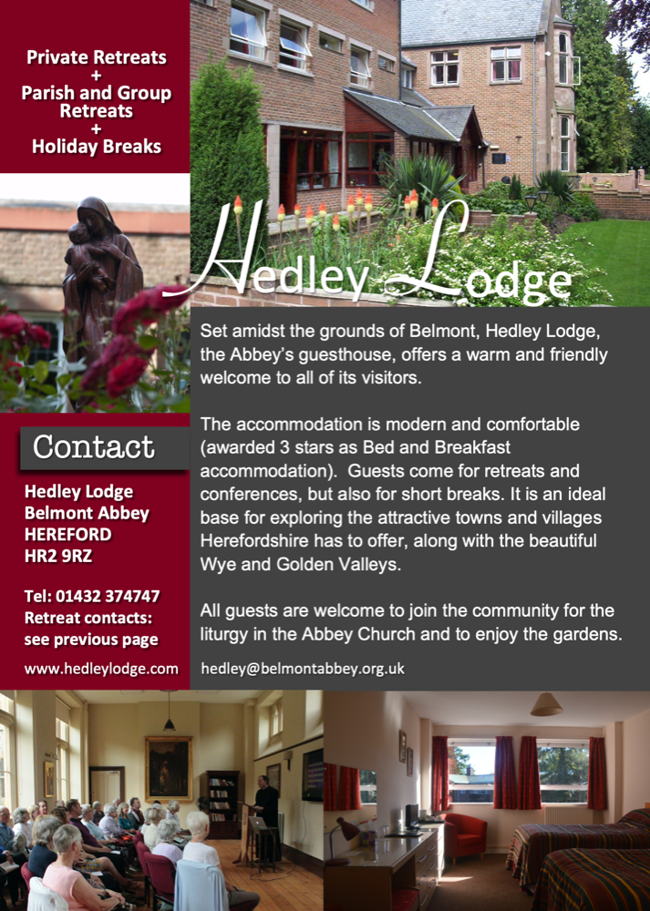 Hedley Lodge is the Abbey Guesthouse which offers modern, comfortable accommodation. Guests are invited to enjoy the peace of the monastery gardens.  Guests of all denominations and none are welcome to stay.
