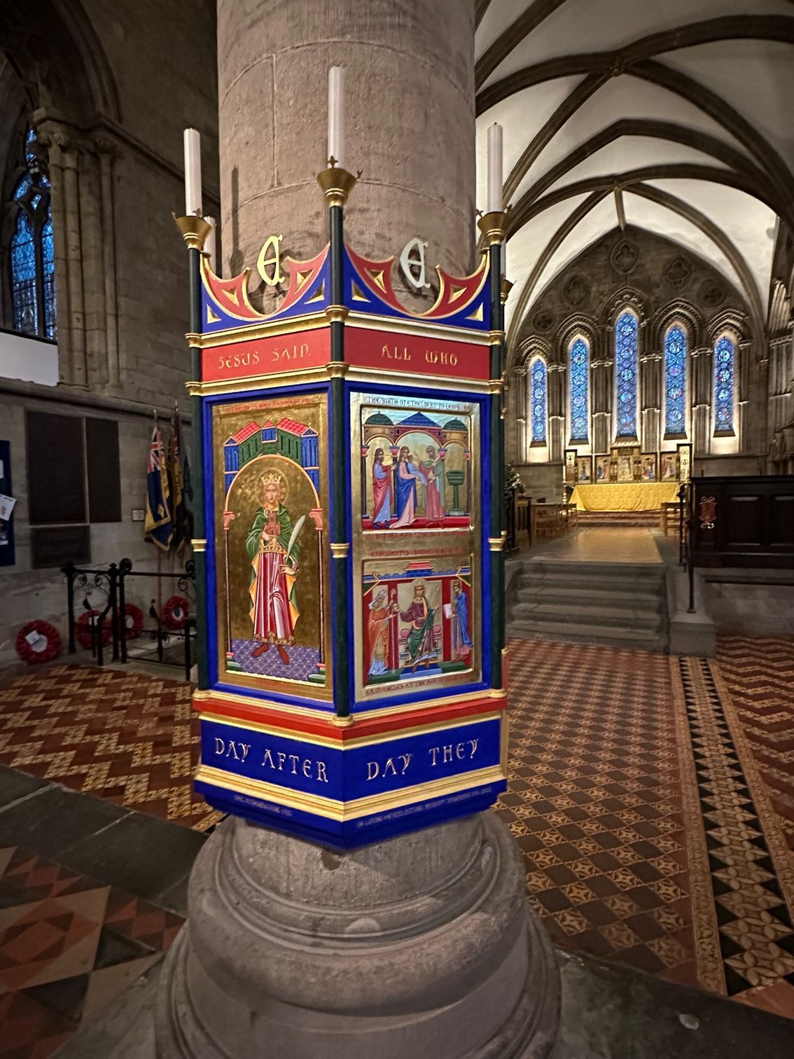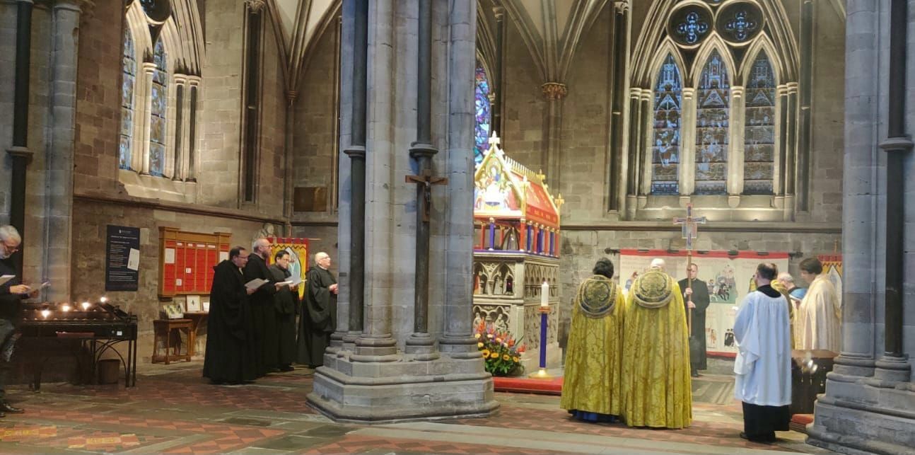 Yesterday afternoon, the monastic community returned to Hereford Cathedral after the hiatus of Covid lockdowns, at the invitation of the Dean and Chapter, to sing Vespers in his honour. I find the cathedral particularly prayerful and it’s always a powerful experience to sing Vespers there or just to pop in when in town to say a short prayer. The restored tomb of St Thomas adds a certain spiritual edge to that house of prayer, the place where so many miracles took place at his shrine in the Middle Ages. I’ll attach a few photographs of the celebration. We were truly blessed to be present.