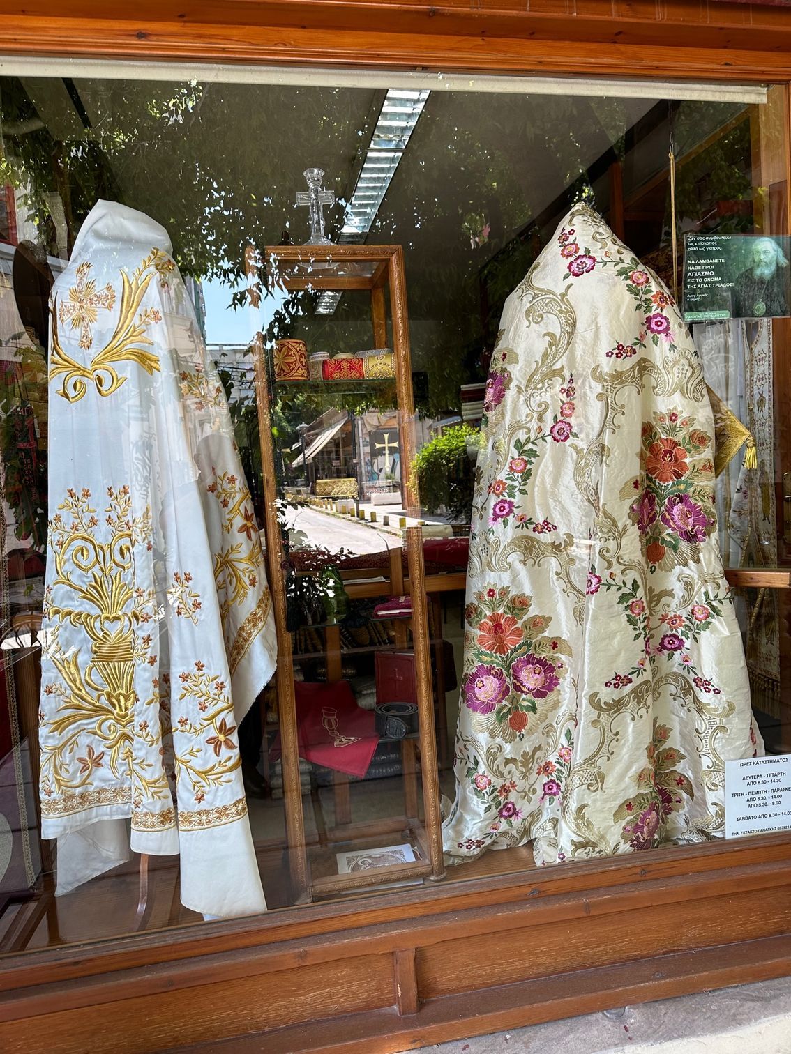 Following a day of complete rest, yesterday my friend Vasilis took me into the old city of Saloniki for a walk through our student day haunts, hardly changed in 60 years, and to see the new market, just opened, and the ongoing works on the long-delayed underground. But to begin with, a visit to the same shop we’ve been frequenting for 30 years to buy incense from Mount Athos for Peru. Opposite there was a shop where leather belts are made to measure while you wait, so Vasilis had a couple made for his expanding waistline. We also took a look at one of the many ecclesiastical tailors making vestments. Then it was on to the new market, exaggeratedly smart and hygienic. It was time for drink and a snack, so we sat at the pavement of well known snack bar for tsipouro and homemade sausages, as we reviewed our lives and thought of the years ahead and watched the world go by.