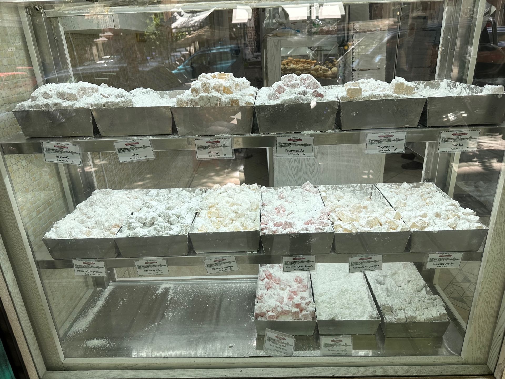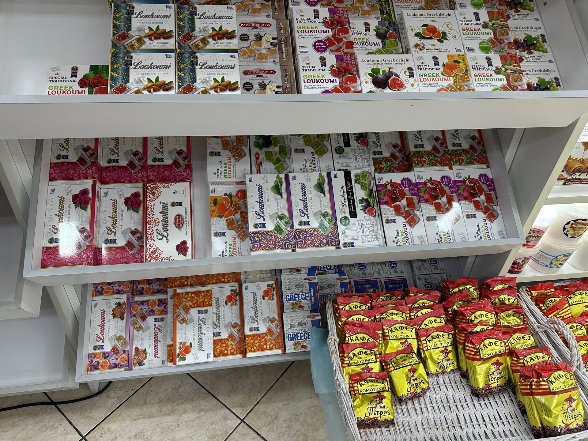 Now it was time to walk around the old market, admiring the magnificent displays of fresh fish, meat and poultry, cheese, olives, olive oil, fruit, nuts, herbs and vegetables. Weighed down with a vast amount of shopping we gradually made our way back to the car, but there was still one shop to visit, the loukoumia shop and workshop. This is Greece, so we don’t speak of Turkish Delight, the authentic article having nothing in common with what we eat in the U.K. When we got home, I was so tired, I collapsed on my bed and slept until seven o’clock, when I celebrated Mass with Sandra, who can remember the prayers still, yet has the greatest difficulty trying to read the first reading. Her Alzheimer’s is advancing rapidly. We didn’t have lunch until 8pm, but that seemed just about right!