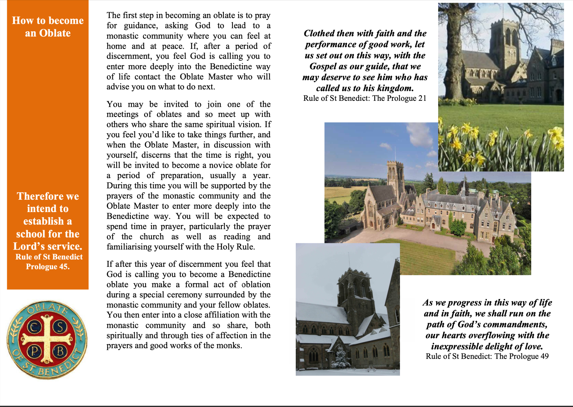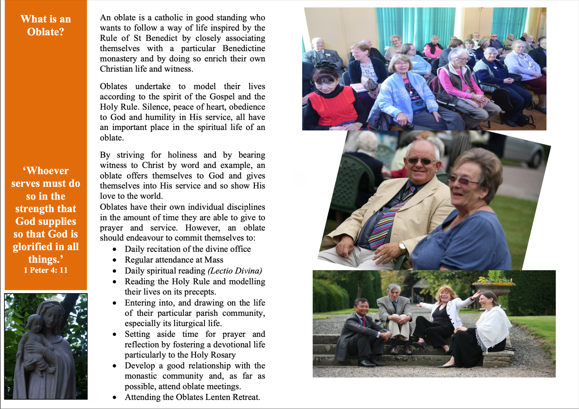 Oblates seek to follow Christ more closely by following closely the wise teaching of St Benedict in his Rule, as far as it is applicable to their daily lives. This would include prayer, liturgy and reflecting on the Sacred Scriptures.